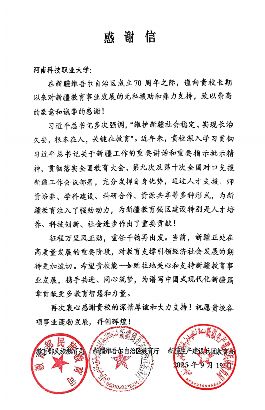 近日,在新疆维吾尔自治区成立70周年之际,教育部民族教育司、新疆维吾尔自治区教育厅和新疆生产建设兵团教育局向我校长期以来对新疆教育事业发展的无私援助和鼎力支持,致以崇高的敬意和诚挚的感谢!