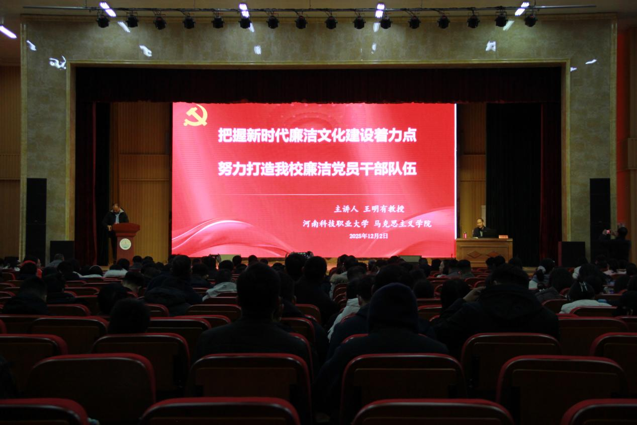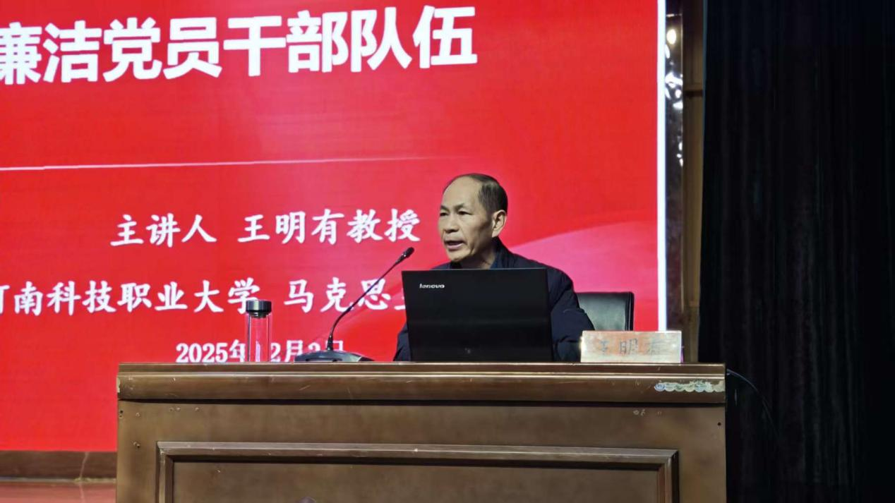 为深入贯彻落实新时代廉洁文化建设要求,切实加强全校党员干部廉洁自律教育,营造风清气正的校园政治生态,12月2日,我校组织部、纪委办联合主办的廉政党课讲座在图书馆三楼报告厅顺利举行。王明有教授受邀担任主讲人,全校各单位党员领导干部代表及马院全体教师参加本次讲座,讲座由校纪委副书记陈见辉主持。